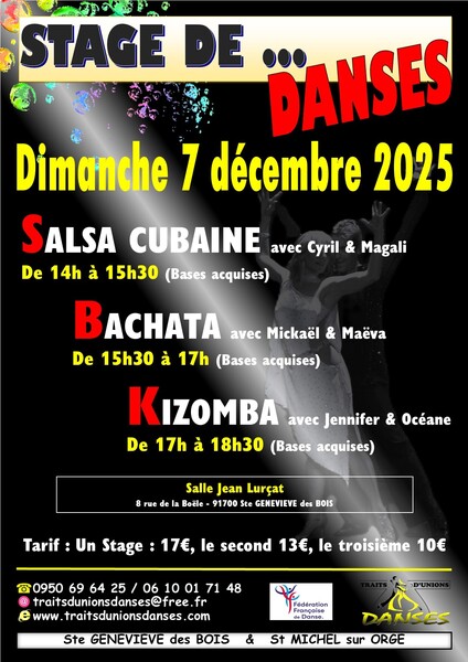 Date : 07/12/2025 (Événement passé) Horaires : De 14h à 18h30 Tarifs : 17€ pour un stage et 13€ pour le deuxième et 10€ pour le troisième Organisateur : TRAITS D'UNIONS DANSES Adresse de l'événement : 8 RUE DE LA BOÊLE 91700 STE GENEVIEVE DES BOIS Informations complémentaires : Au programme :