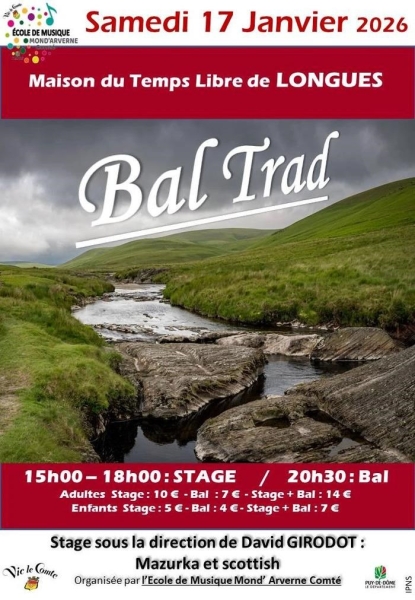 Dates : Samedi 17/01/2026, Dimanche 18/01/2026 Horaires : 15h à 18h (stage), 20h30 (bal) Tarifs : Adultes : Stage 10€, Bal 7€, Stage + Bal 14€. Enfants : Stage 5€, Bal 4€, S Organisateur : ÉCOLE DE MUSIQUE MOND'ARVERNE COMTÉ Adresse de l'événement : MAISON DU TEMPS LIBRE DE LONGUES RUE DU VIGNOLAT 63270 VIC LE COMTE Informations complémentaires : Animation : David Girodot. Danses : mazurka et scottish. Stage suivi d?un bal trad. Danses pratiquées : Danse folklorique Référence de l'annonce : 61171