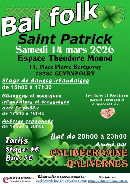 Date : Samedi 14/03/2026 Horaires : 15h à 23h Tarifs : Stage 5€ Bal 5€ Organisateur : CALIBEURDAINE Adresse de l'événement : ESPACE THÉODORE MONOD 11, PLACE PIERRE-BÉRÉGOVOY 78280 GUYANCOURT Danses pratiquées : Danse celtique, Danse folklorique Référence de l'annonce : 63962