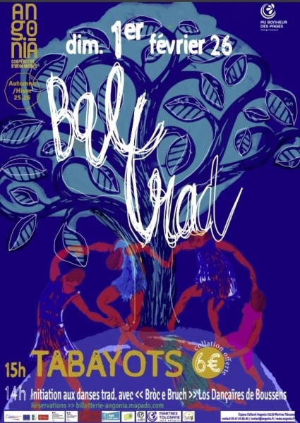 14h : Initiation aux danses trad avec Los Dançaires de Boussens et le groupe Bròc e Bruch 15h : Animation "Tabayots" Salle des fêtes. Collation offerte. Musique traditionnelle, influences jazzy et funky. Public débutant et confirmé. Danses pratiquées : Danse folklorique Référence de l'annonce : 61268 call05 61 98 61 79