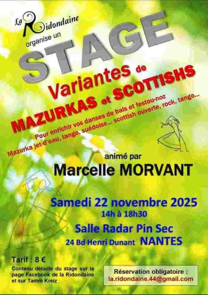 Date : Samedi 22/11/2025 Horaires : 14h à 18h30 Tarifs : 8€ Organisateur : LA RIDONDAINE Adresse de l'événement : SALLE DU RADAR PIN SEC 24 BOULEVARD HENRI DUNANT 44000 NANTES Informations complémentaires : Animation : Marcelle Morvant. Réservation obligatoire. S'adresse à des danseurs maîtrisant les pas de base de la mazurka et de la scottish. Au programme : variantes de mazurkas (Samatan, jet d'eau, tango, suédoise, etc.) et de scottishs (ouverte, rock, tango, du Lauragais). Une ou deux figures plus techniques et valse à 5 temps. Contenu détaillé disponible sur la page Facebook de La Ridondaine et sur Tamm Kreiz. Danses pratiquées : Danse folklorique Référence de l'annonce : 54445