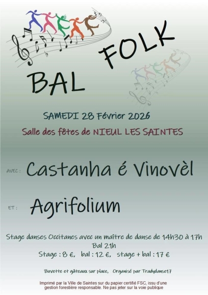 Dates : Samedi 28/02/2026, Dimanche 01/03/2026 Horaires : 14h30 à 17h Tarifs : Stage 8€, bal 12€, stage + bal 17€ Organisateur : TRADANSES17 Adresse de l'événement : SALLE DES FÊTES 21 RUE SAINT-MARTIN 17810 NIEUL LES SAINTES Danses pratiquées : Danse folklorique Référence de l'annonce : 58417