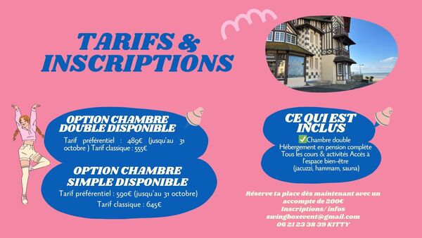 Les tarifs comprennent l'hébergement en pension complète à l'hôtel, tous les cours et activités et l'accès à l'espace bien-être (jacuzzi, hammam, sauna). Danses pratiquées : Solo Jazz, Swing Référence de l'annonce : 52718 call06 21 23 38 39